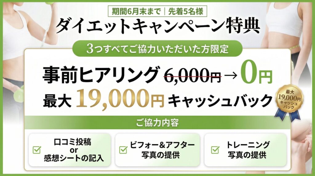無理のないトレーニング、柔軟な予約対応、シンプルで安心な料金設計。さらにキャッシュバック&割引クーポンで、続けるほどお得に。だから、気づけば1年。自然と変わる。